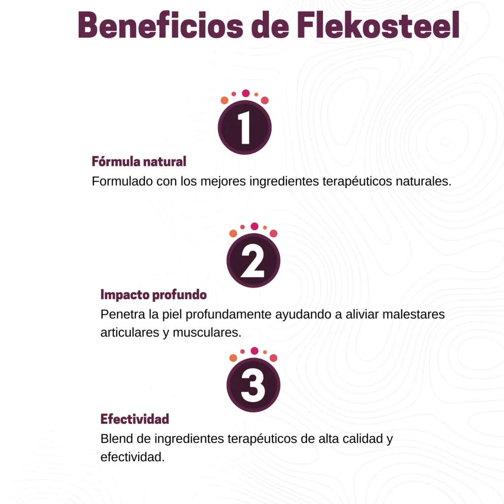 ¡Recupera tu movilidad y vive sin dolor! Flekosteel alivia de forma rápida el dolor articular y muscular, reduce la inflamación y mejora la movilidad. Con uso regular, frena el desgaste del cartílago y favorece su regeneración. ¡Resultados visibles desde la primera aplicación!